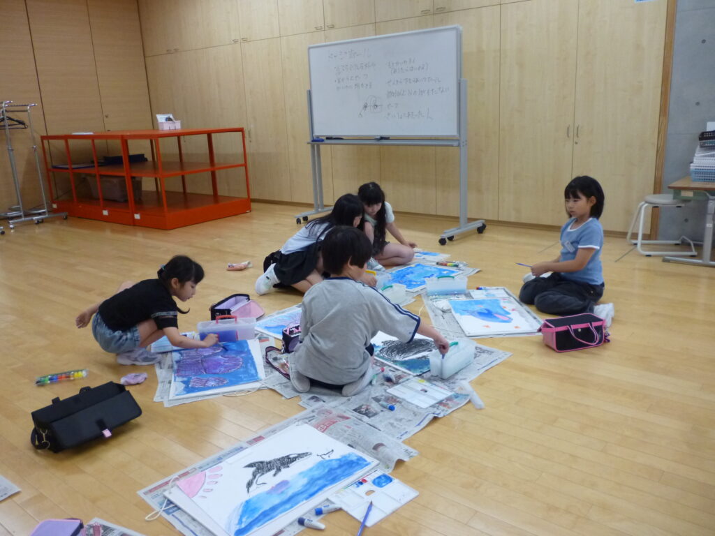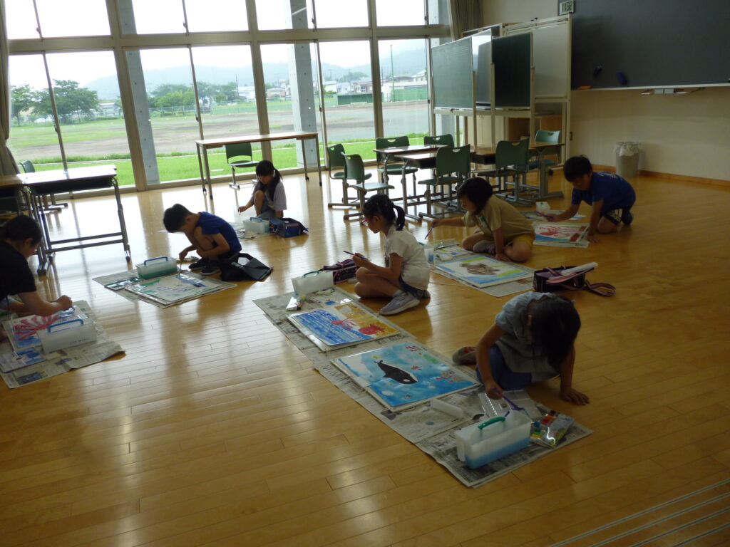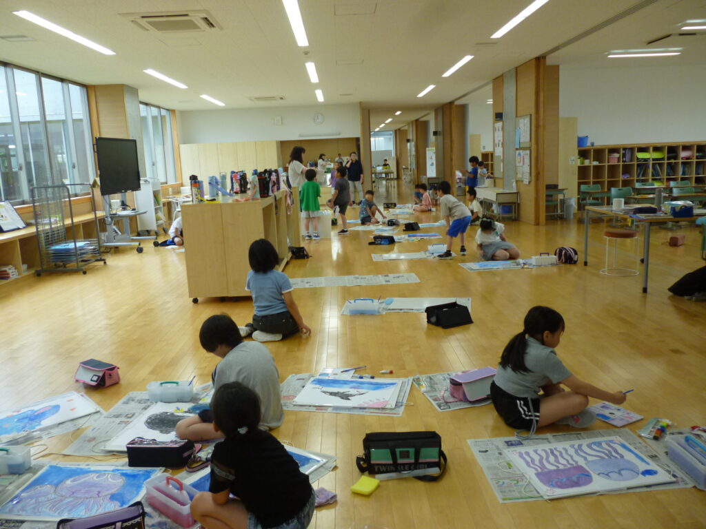 教室とワークホールを活用して、絵を描いていました。子どもたちは、絵の具を使って思い思いに色づけしていました。作品の完成が待ち遠しいです。
