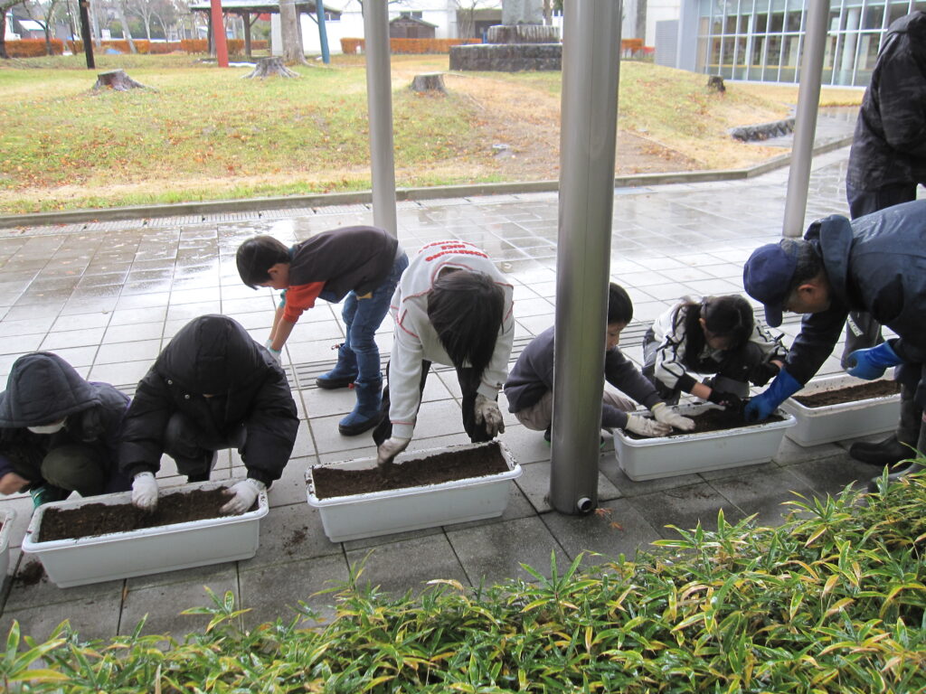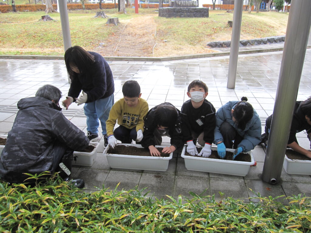 2年生がプランターにチューリップの球根を植えていました。花が咲く頃には進級しています。楽しみですね。