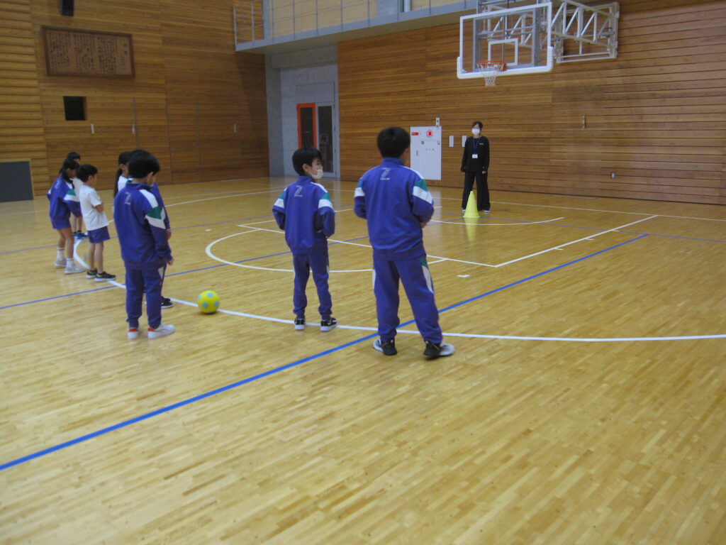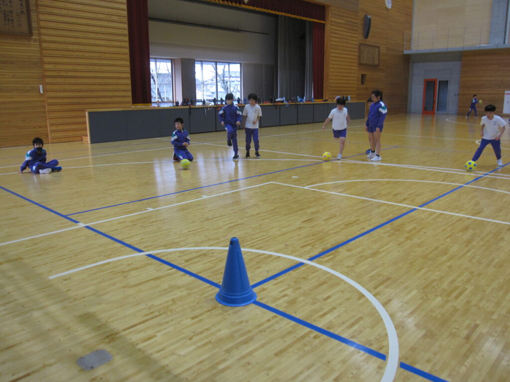 3年生が体育の学習で室内サッカーを楽しんでいました。