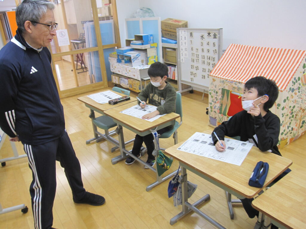 ゴム紐を高跳びのバーに見立てて、何度も練習を繰り返していました。