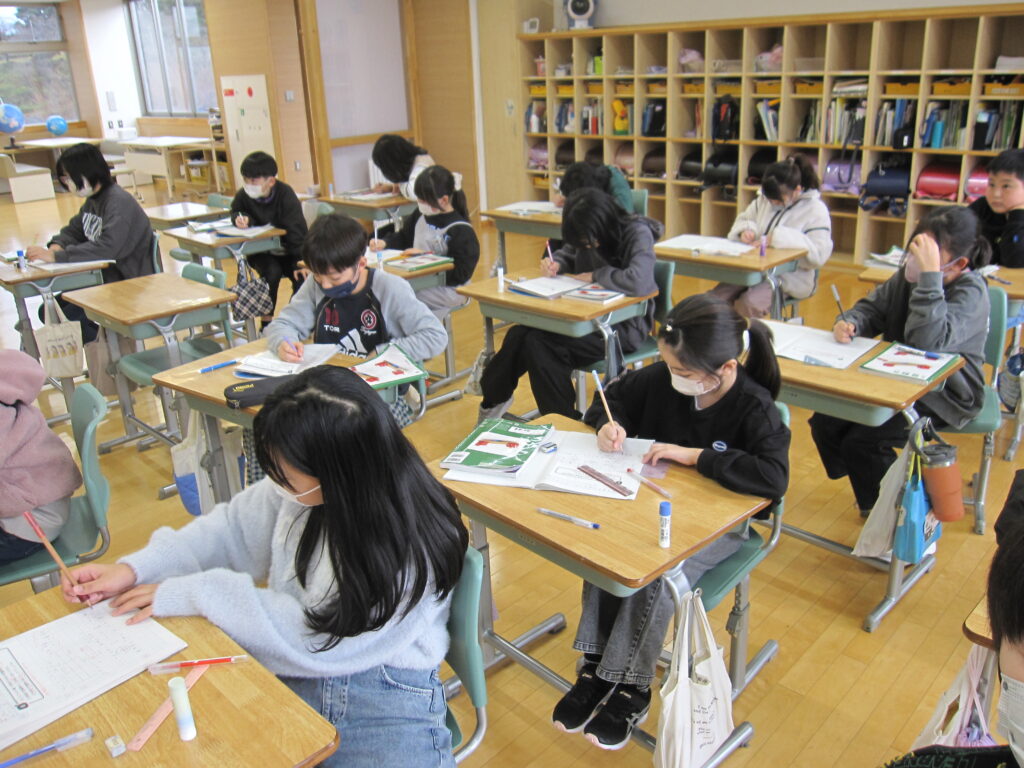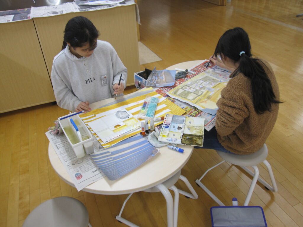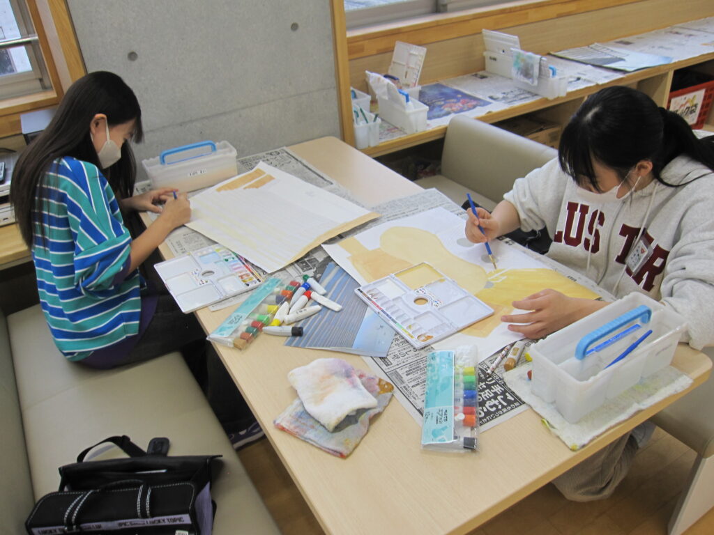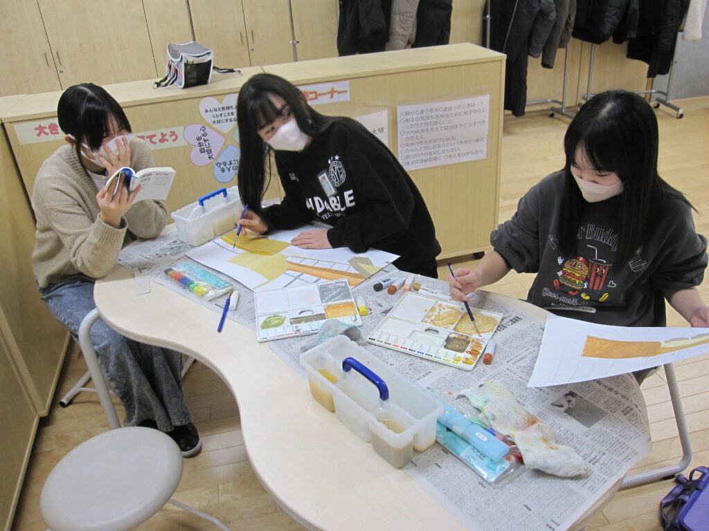 6年生が図工の学習で、ワークホールで色塗りをしていました。完成が楽しみです。