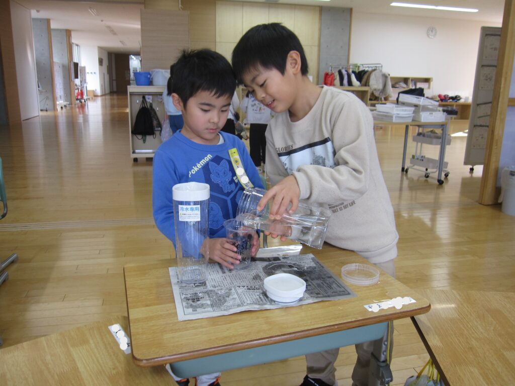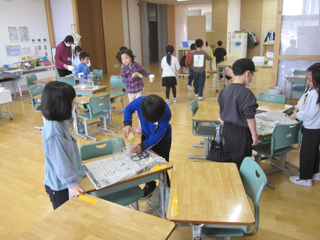 1年生は「水のかさ」の学習をしていました。こぼさないでね。