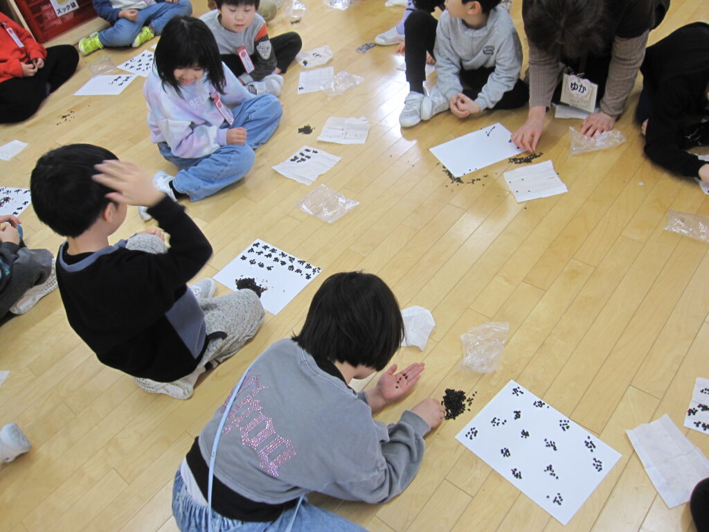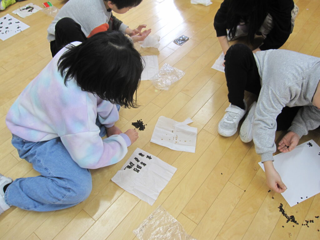 1年生は算数「大きな数」の学習で、自分たちで育てたアサガオの種を10のまとまりを作って数えていました。