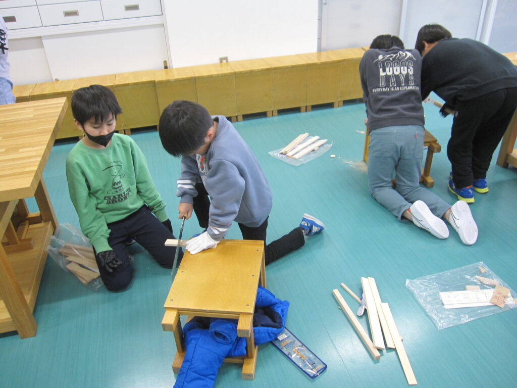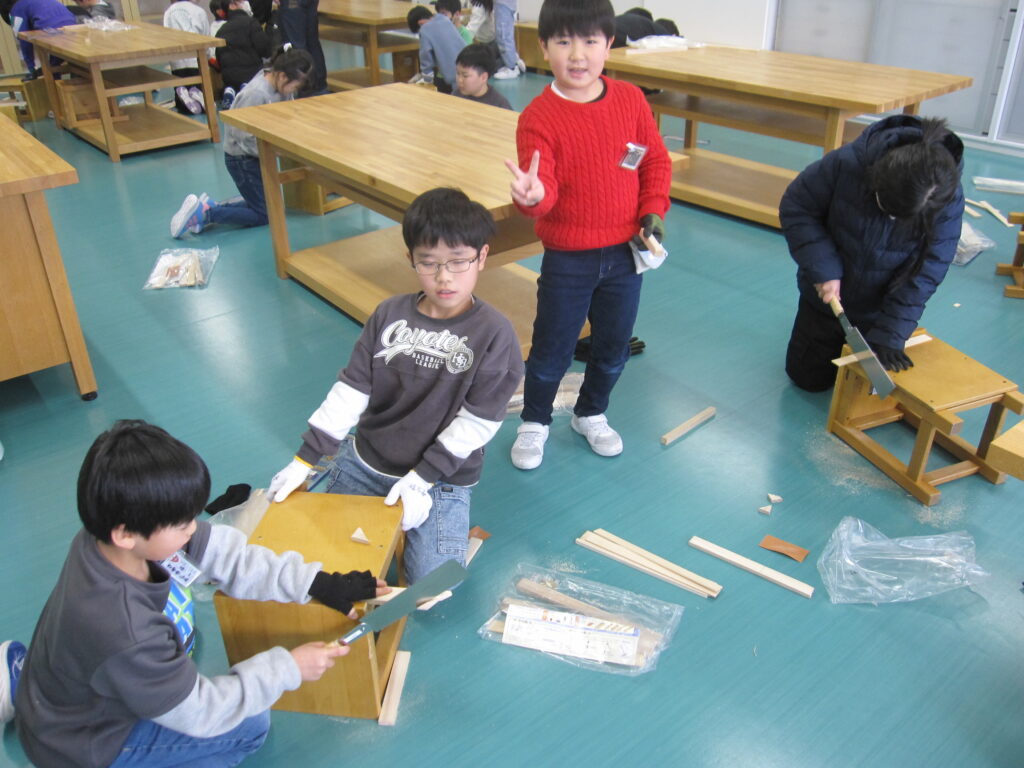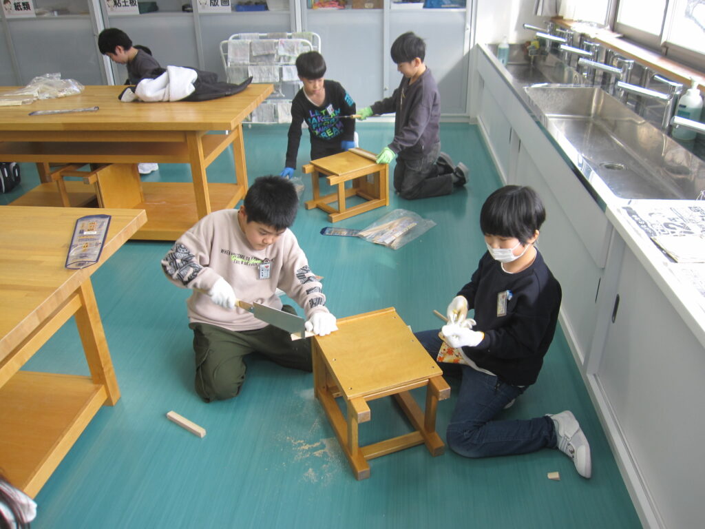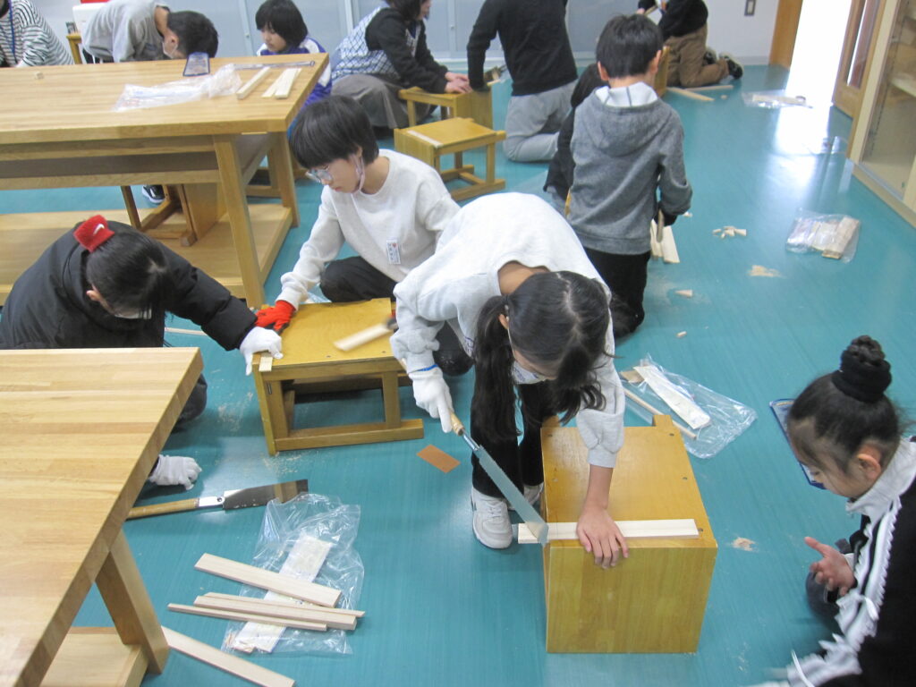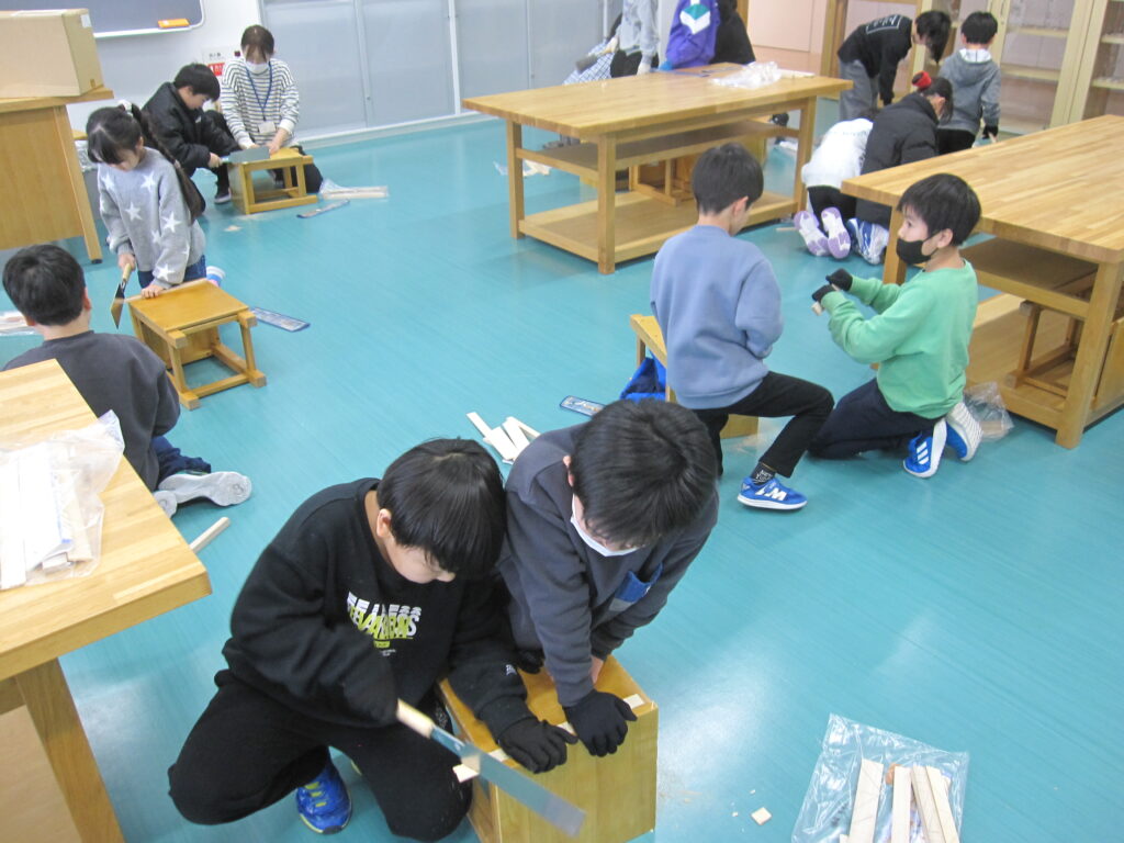 3年生は図工室でのこぎりを扱っていました。友達とペアになって安全に活動していました。