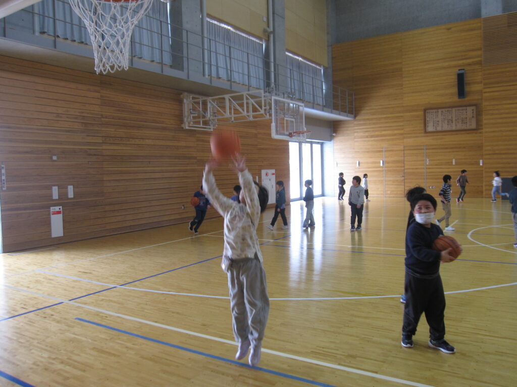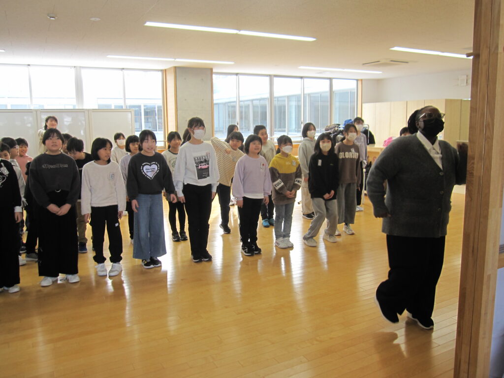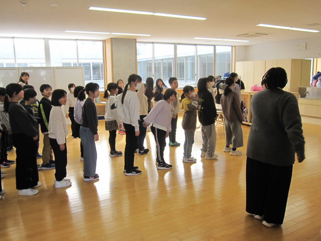 4年生、外国語活動。ALTの発声に合わせて、方向転換していました。