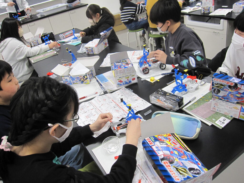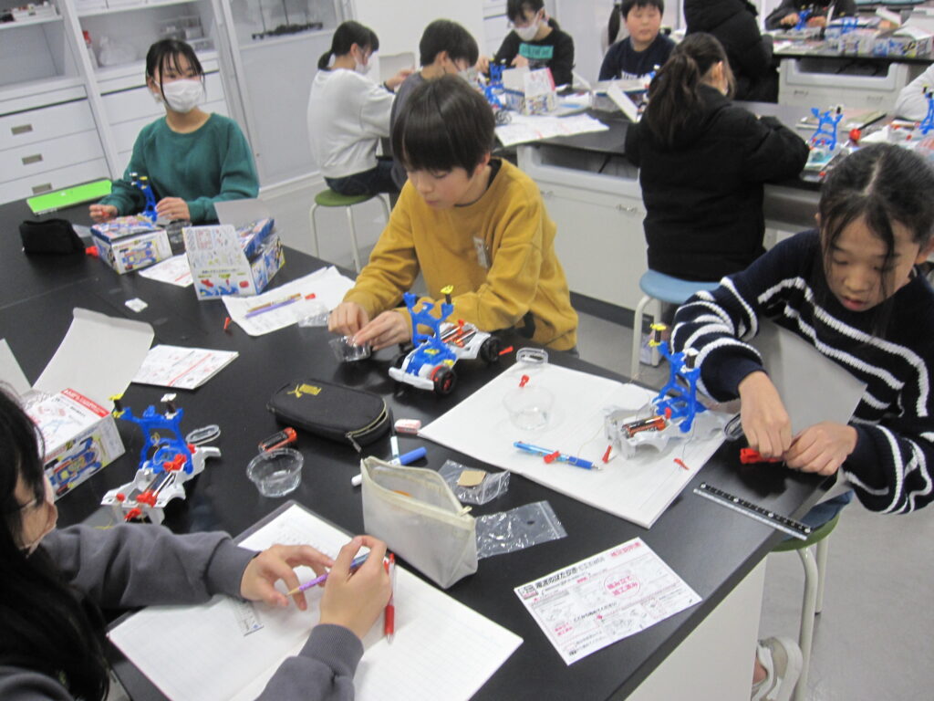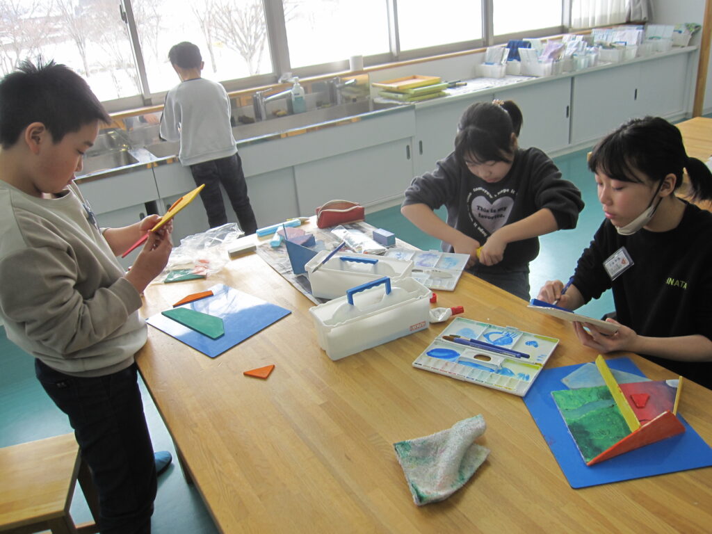 4年生、図工。色づけした木片を思い思いにつなげていました。