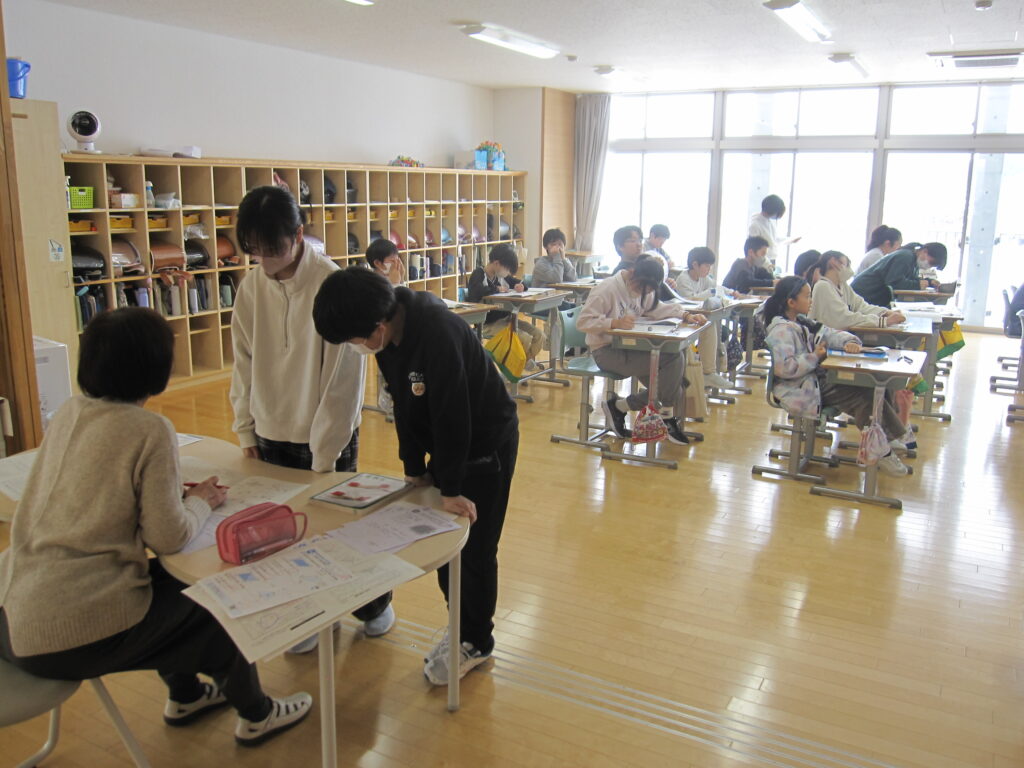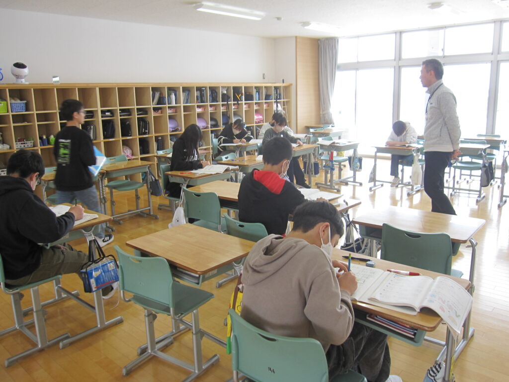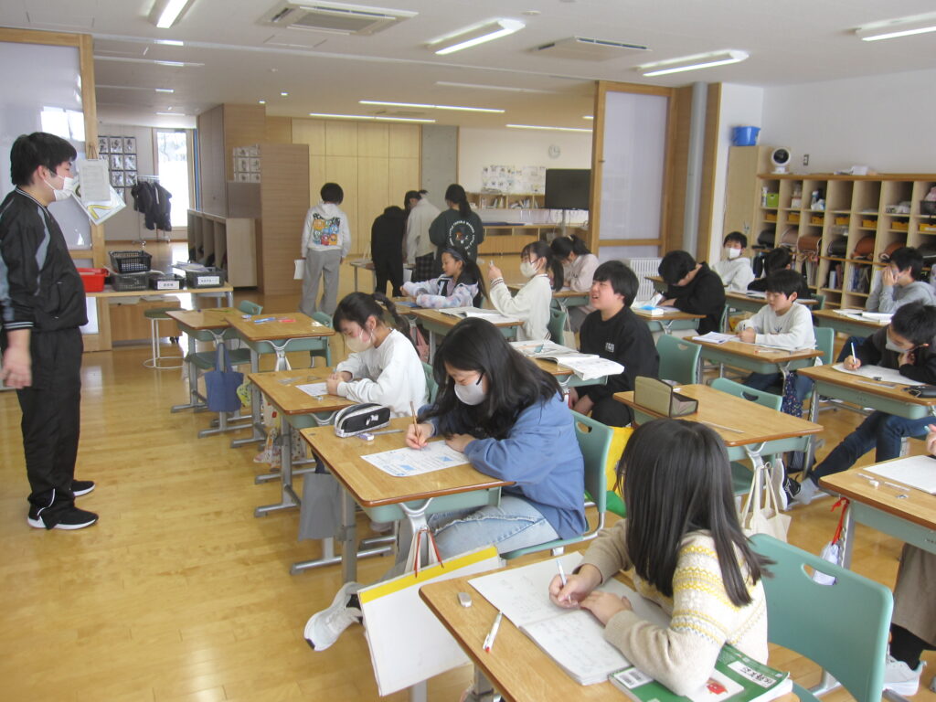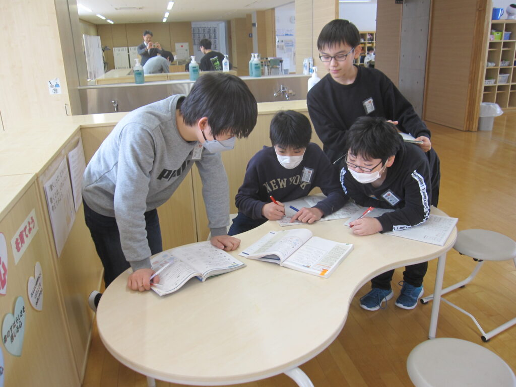 5年生、算数。課題のできた子から、丸付けをしてもらっているようでした。