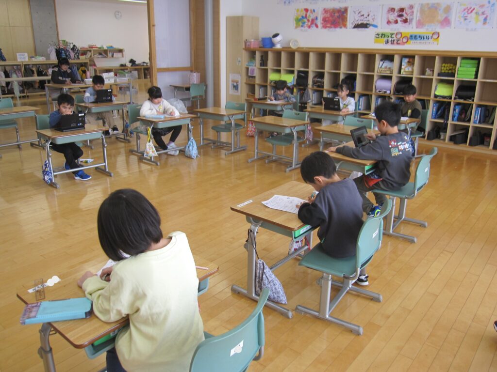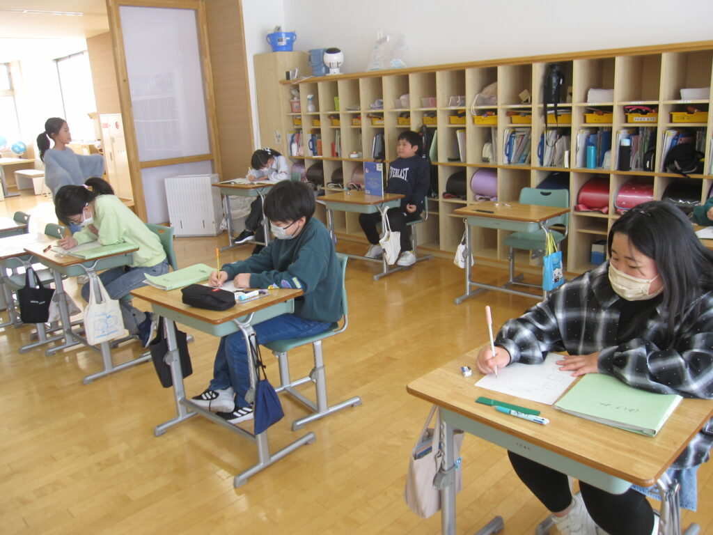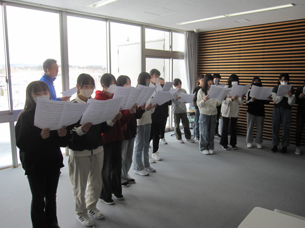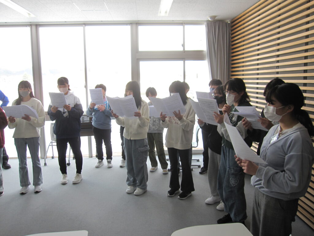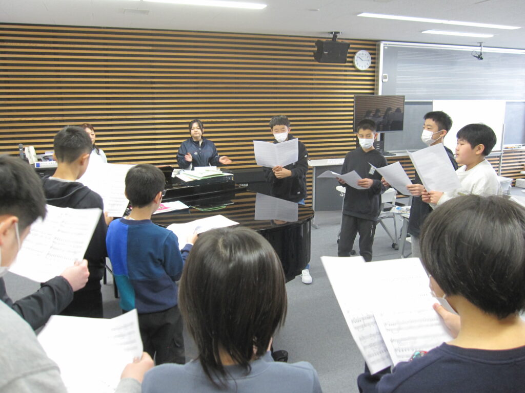 6年生、音楽の授業の様子です。高音と低音のパートに分かれて合唱練習をしていました。