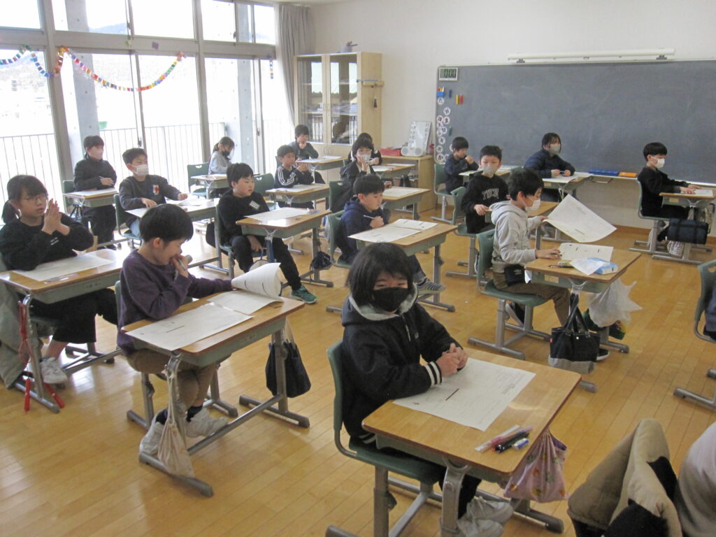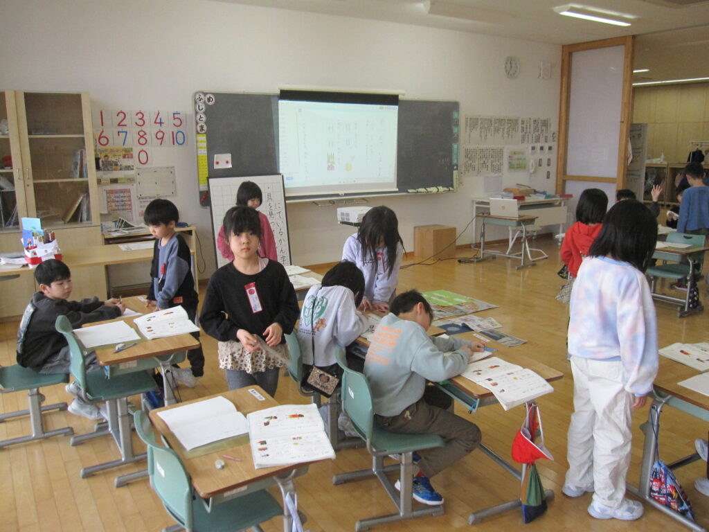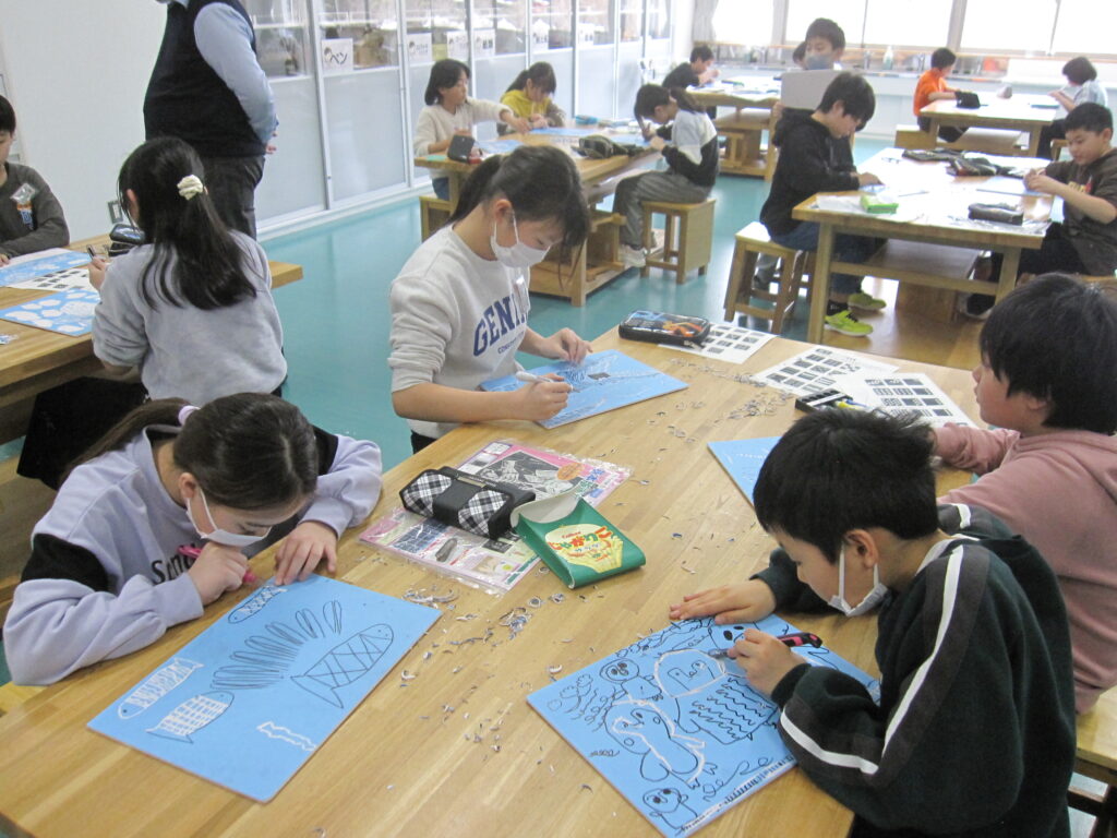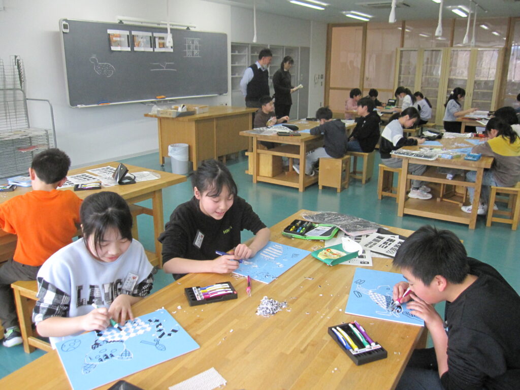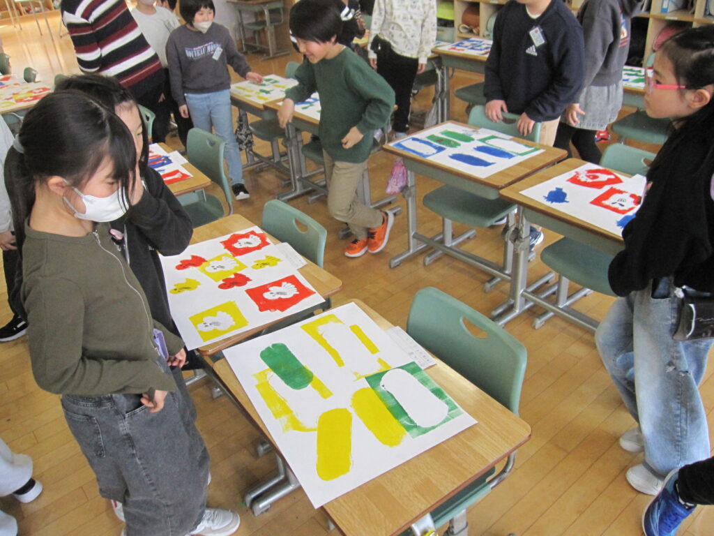 2年生が完成した版画の作品をお互いに見合って、感想を伝え合っていました。
