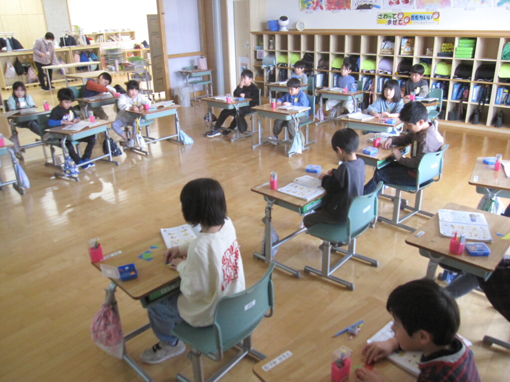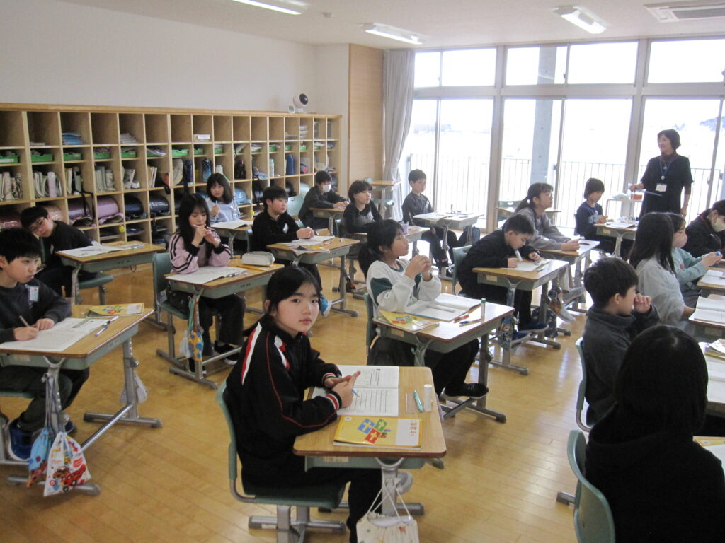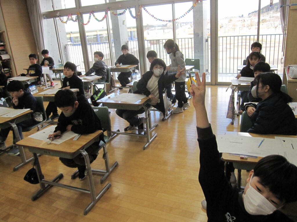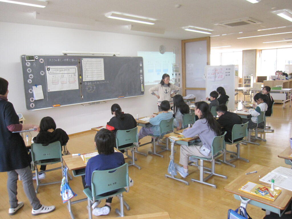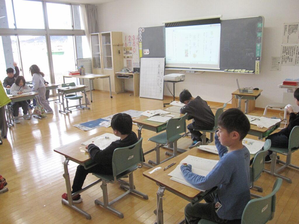2年生が完成した版画の作品をお互いに見合って、感想を伝え合っていました。