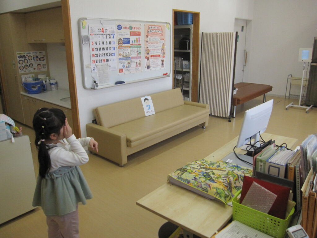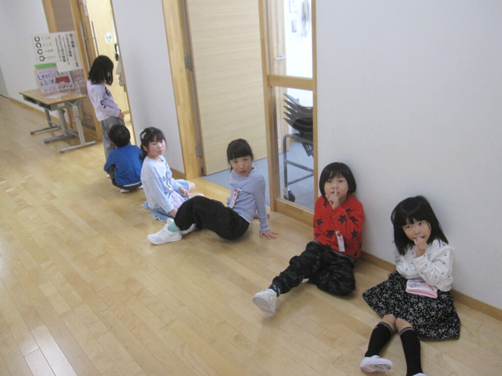 保健室前で視力検査の順番を待つ1年生。