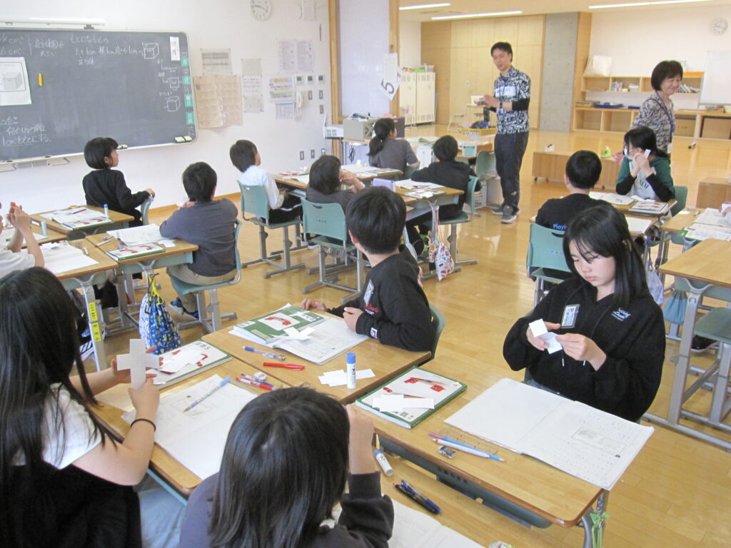 5年生は、直方体や立方体の展開図を組み立てていました。